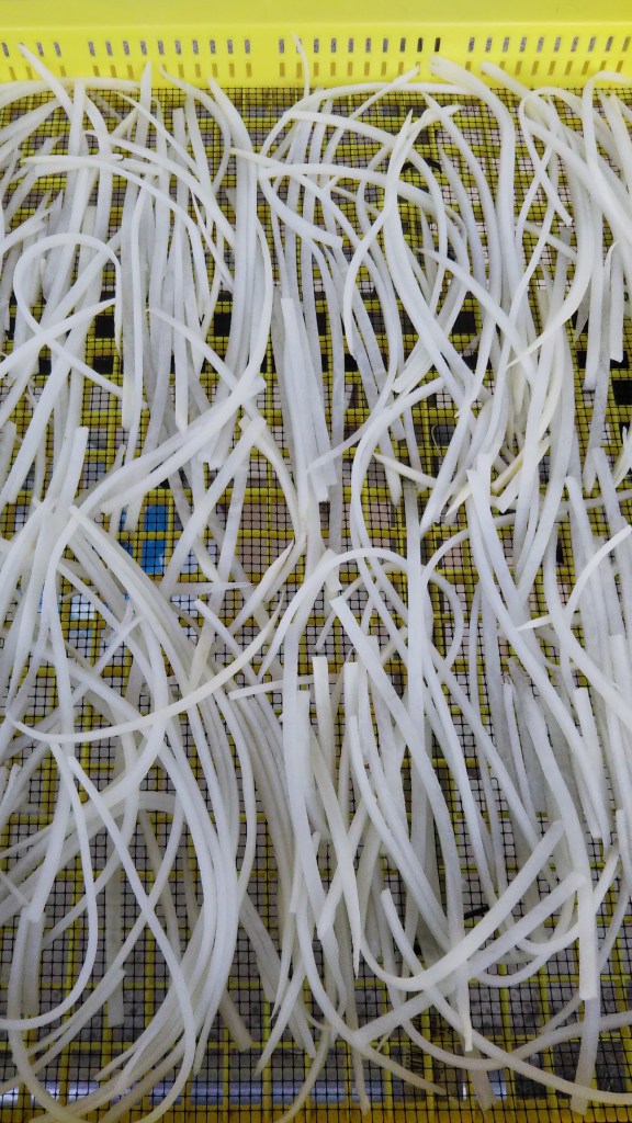 夕方、細くけずって干し台に薄く並べ,夜中の凍結を待つ。