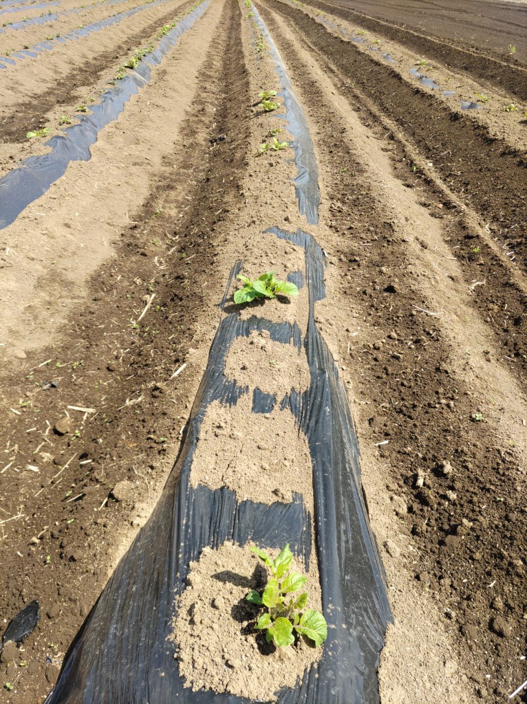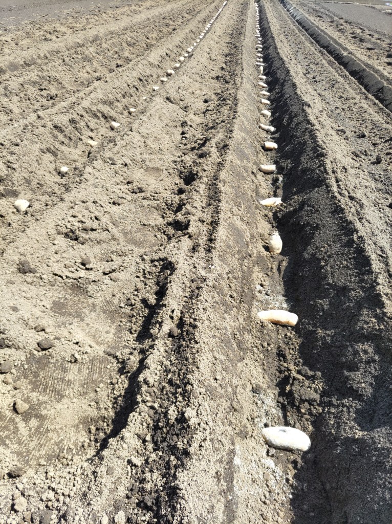 ジャガイモの植え付けをしました。Ph6.5の弱酸性、硫化マグネシウム(硫安)を入れて土壌の酸性度を管理。堆肥と化成肥料で3週間前に圃場準備。当日は、植え溝を掘るだけ。「キタアカリ」、「とうや」、「メークイン」、「インカのめざめ」を植付けました。