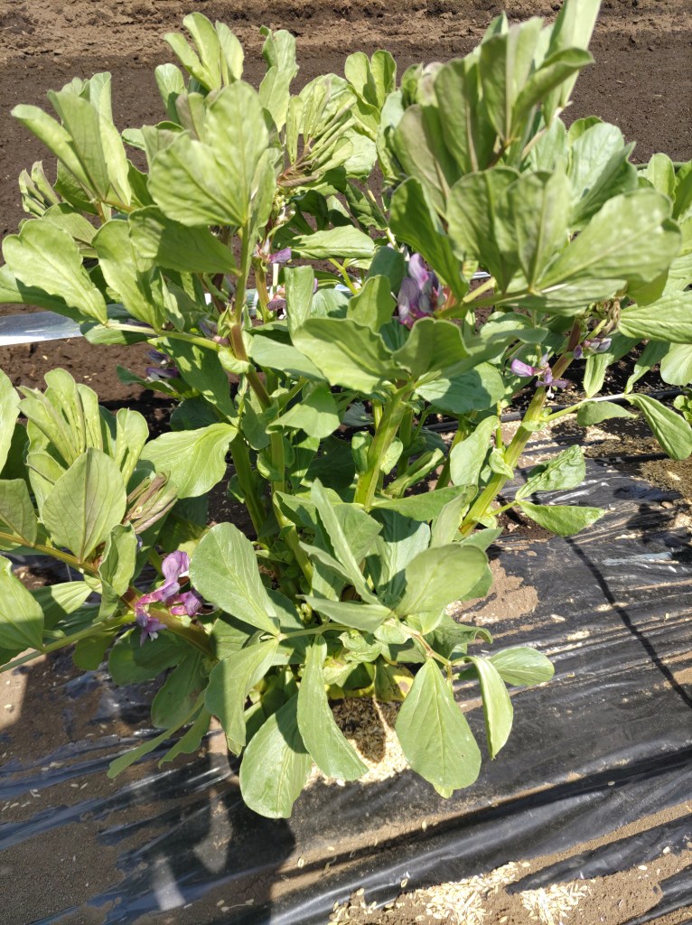 そら豆に花が咲いた。1株7本立てにして、追肥して、アブラムシよけの消毒をして、5月まで待とう。