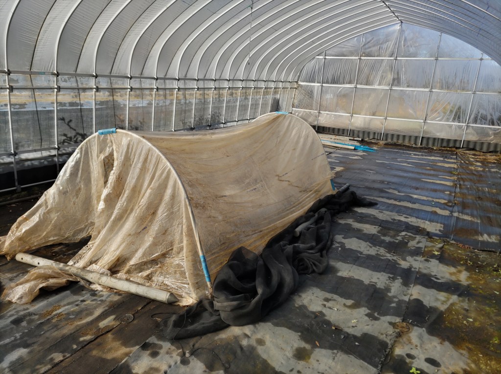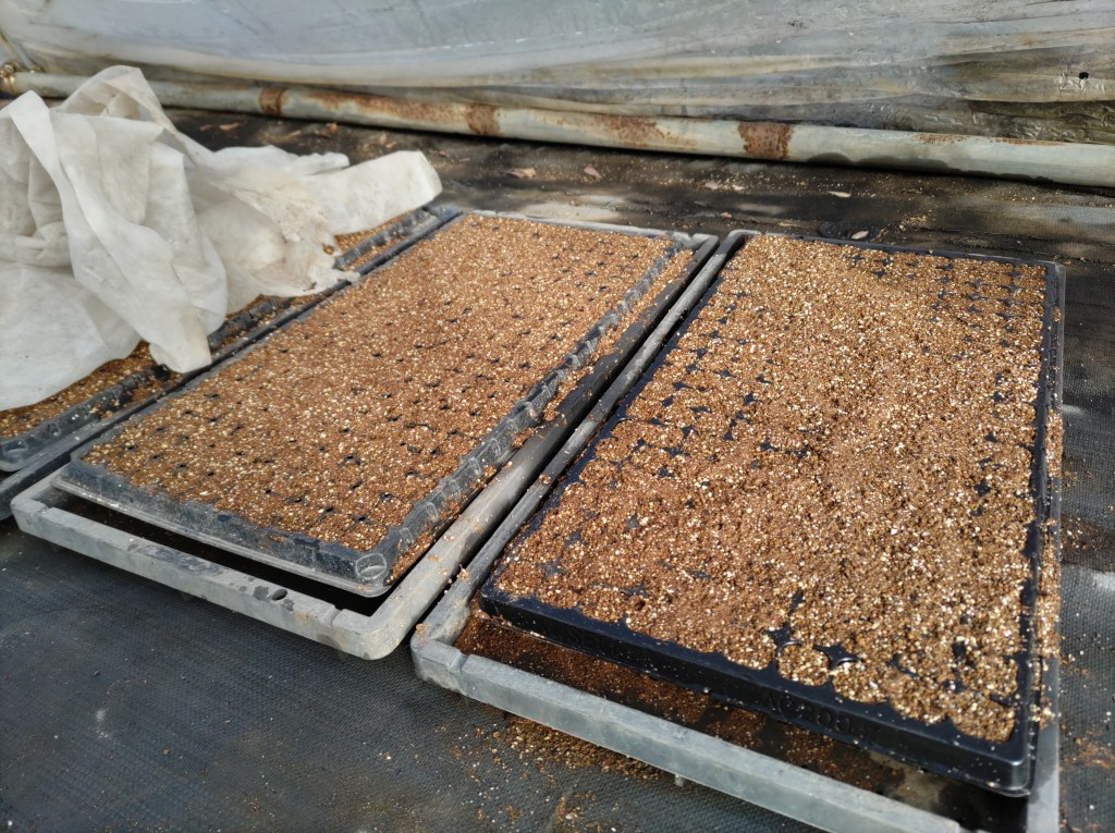 春・夏の野菜に向けて準備が始まりました。まずは「冬ネギ」。ネギ苗の育苗です。セルトレイ200穴を4プレート。ホワイトスターと名月一文字を蒔きました。ホワイトスターはペレットタイプなので蒔きやすい。ハウスの中に二重のトンネル。昼間は20度位に管理。発芽後幼苗期までは乾燥に注意。